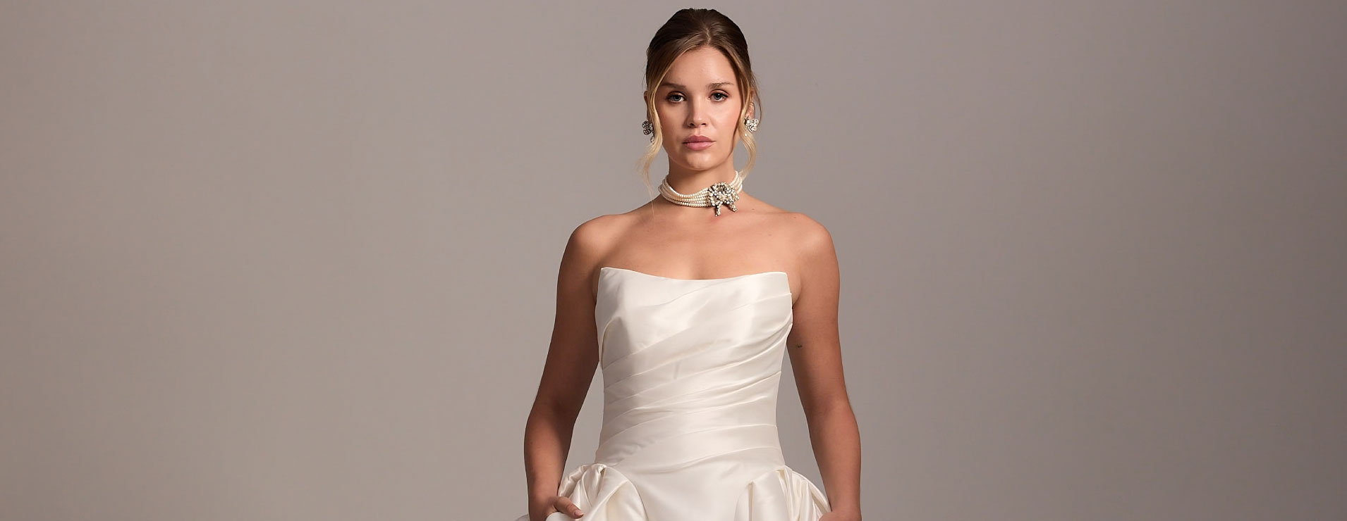 Draped in strapless lace with a sculpted bodice and cathedral veil—Belle is regal romance reimagined🤍